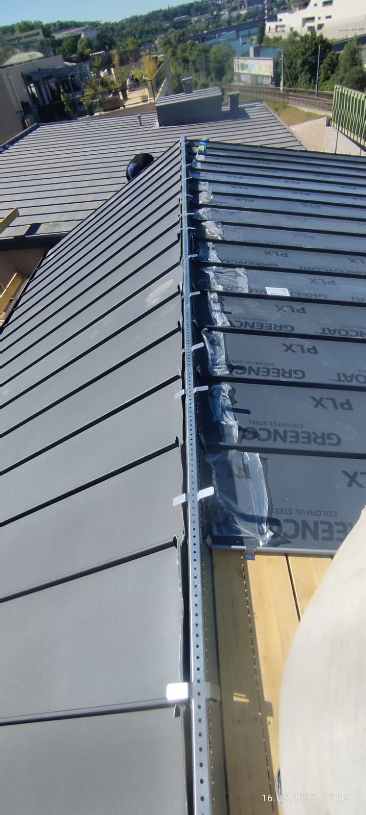 Realisation du couverture en Joint-debout en Acier PLX Noir avec ses accessoires ( Faitage Double pente / Rives / Bande d’égout )