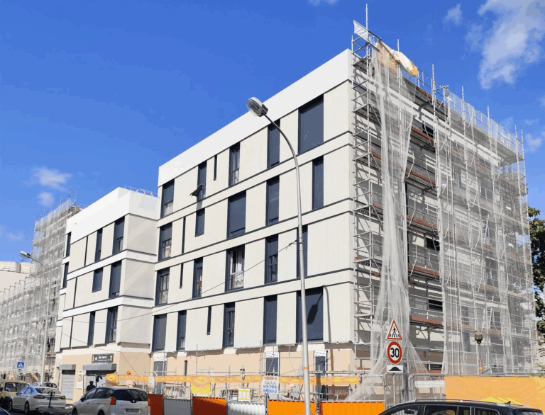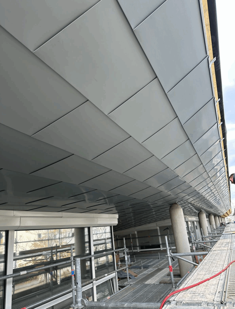 Réalisation pour la société LCC de bacs à joint debout en zinc pigmento rouge, montés en bardage et de couvertines en zinc pigmento rouge